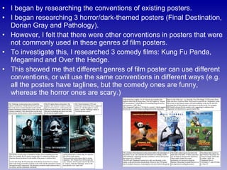 The student began by researching conventions of horror and comedy film posters. They noticed different genres use conventions in different ways. For their own poster, the student included standard elements like the release date and tagline linked to the psychological horror genre. However, they subverted conventions by inverting the colors of the central girl figure, making her appear inhuman and suggesting something supernatural will attack her. The streaks on the walls and the girl's vulnerable positioning imply she will die at the hands of something abnormal. Overall, the poster effectively conveys the horror genre through these visual cues and an unsettling, mysterious atmosphere.