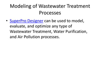 SuperPro Designer and its subset EnviroPro Designer are modeling tools that can be used to model, evaluate, and optimize wastewater treatment processes as well as chemical manufacturing processes. EnviroPro focuses specifically on wastewater treatment and includes unit operation models for biological and physical treatment processes. It allows users to simulate nutrient removal processes and calculate VOC emissions. The software contains extensive databases of chemical components and properties to support rigorous modeling of biochemical reactions and environmental impacts in wastewater treatment systems.