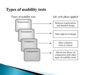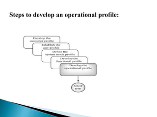 The document discusses quality assurance and control in software development. It states that quality assurance ensures software meets requirements, while quality control evaluates products against standards. It also discusses operational profiles, usability testing, and selecting a team with various qualifications to develop an operational profile/usage model for an automated airline reservation system.