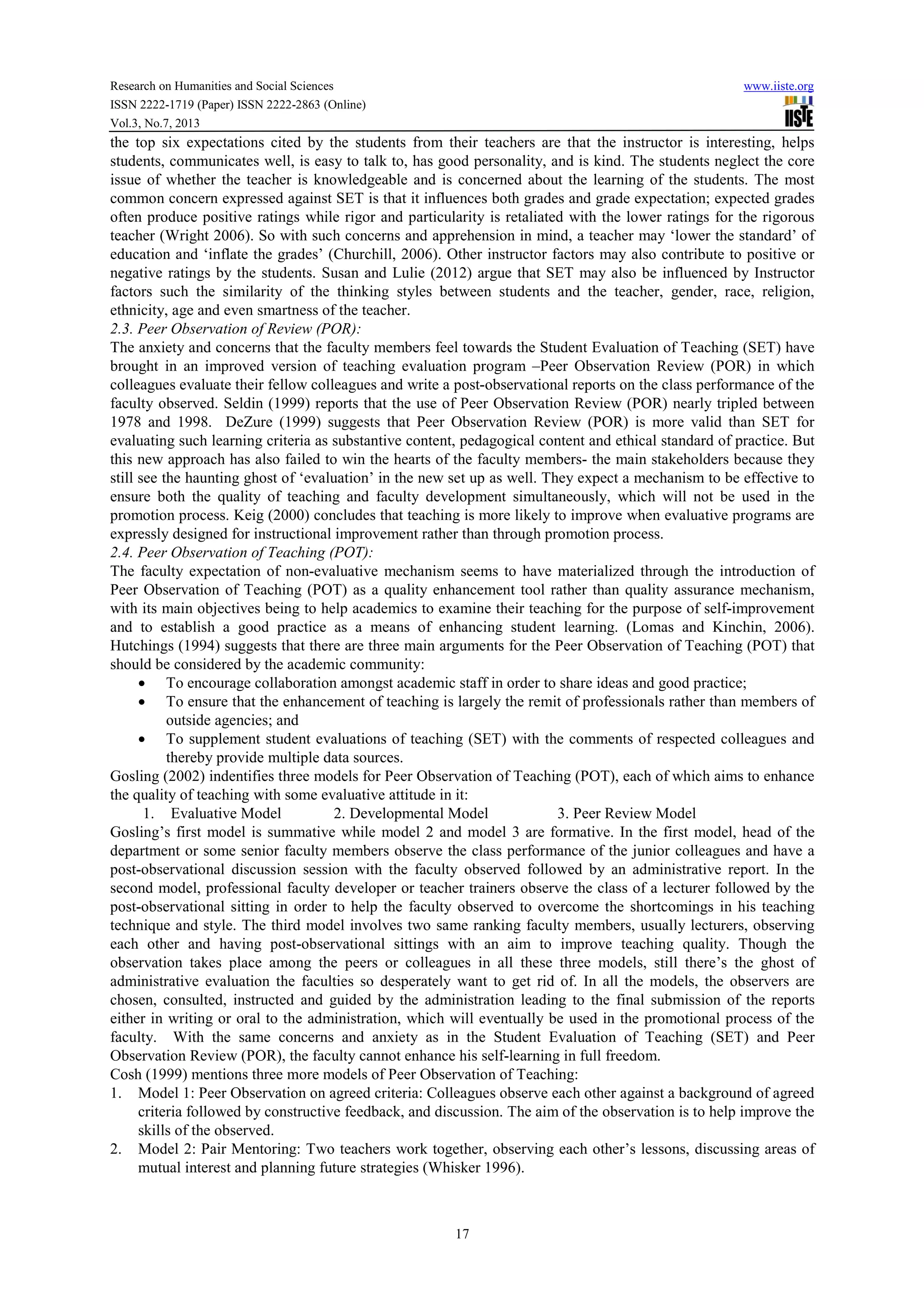 This document summarizes research on different approaches to evaluating teaching quality, including Student Evaluation of Teaching (SET), Peer Observation of Teaching (POT), and Peer Observation of Review (POR). It argues that SET is unreliable and focuses more on instructor personality than actual learning. POT and POR were introduced as alternatives, but faculty still saw them as evaluative and threatening. The document advocates for a reflective approach to POT that ensures quality enhancement without anxiety or resistance from faculty. It discusses different POT models and argues they still involve administrative evaluation, when faculty want evaluation removed from promotion decisions to freely enhance self-learning.