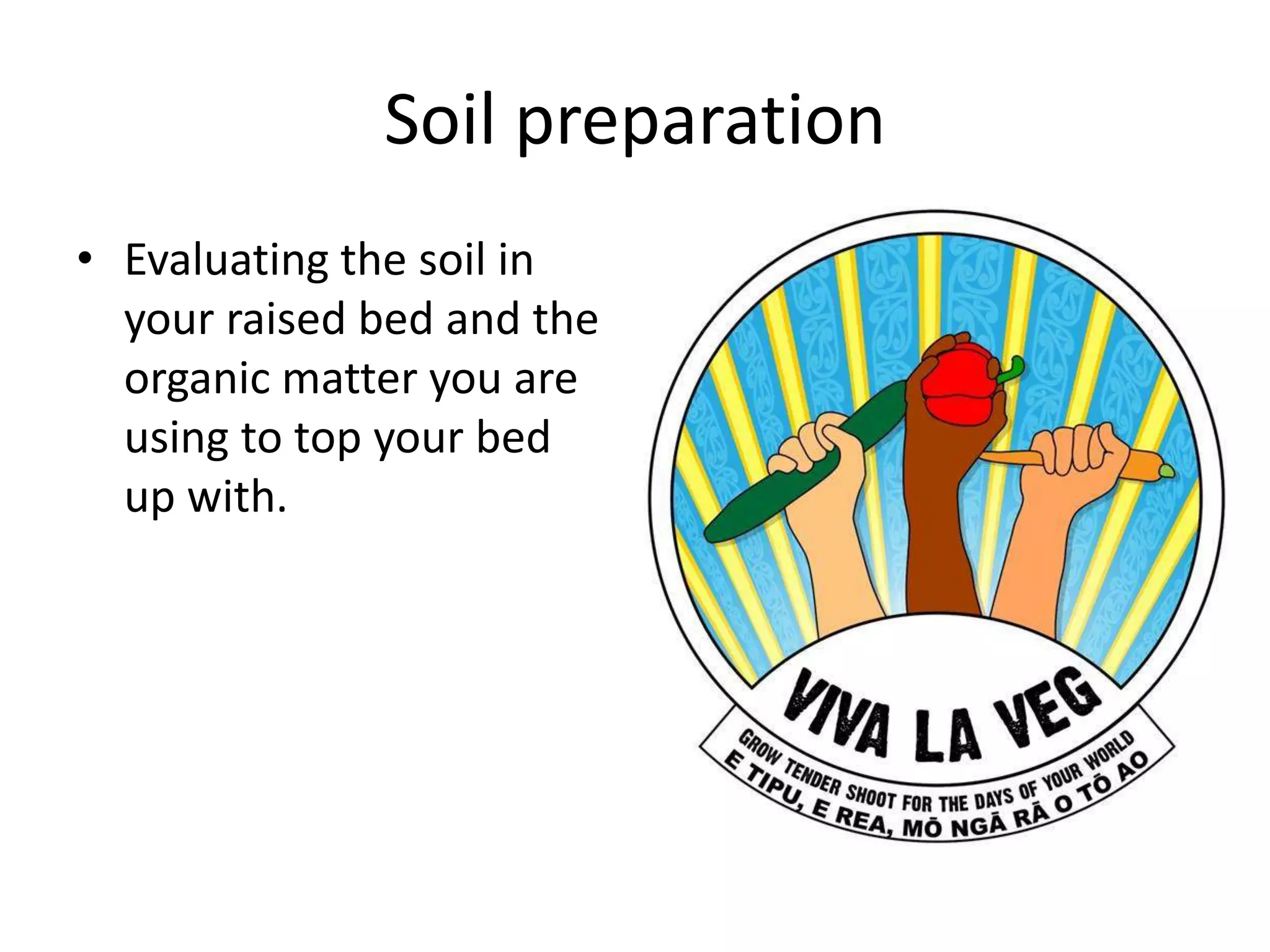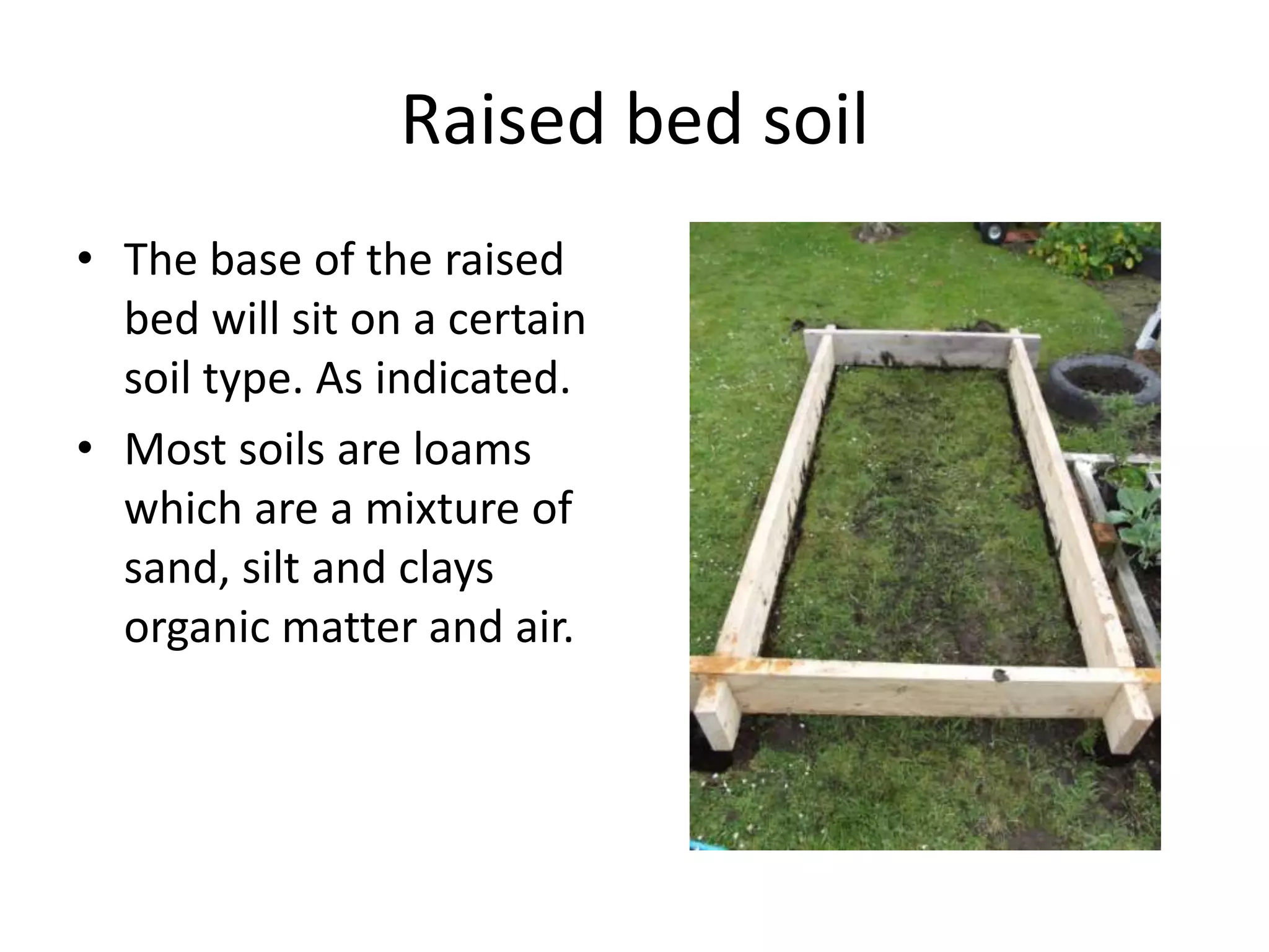 The document provides instructions for preparing soil in a raised bed garden. It discusses evaluating the existing soil type, which can be sandy loam, clay loam or loam. It also describes adding organic matter like compost or manure to improve soil structure and nutrient content. A key recommendation is to turn over the existing soil, break up any clumps, and thoroughly mix in amendments to create a friable soil suitable for growing vegetables.