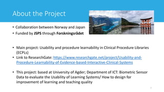 The document discusses a collaborative research project between Norway and Japan that evaluates user experience in virtual learning environments (VLEs) utilizing biometric data. It outlines research questions related to emotional satisfaction and engagement, describes the methods and tools used for data collection, and emphasizes the importance of human-centered design in enhancing the usability of learning systems. The study aims to quickly adapt and improve educational designs based on user feedback gathered through testing in various learning courses.
