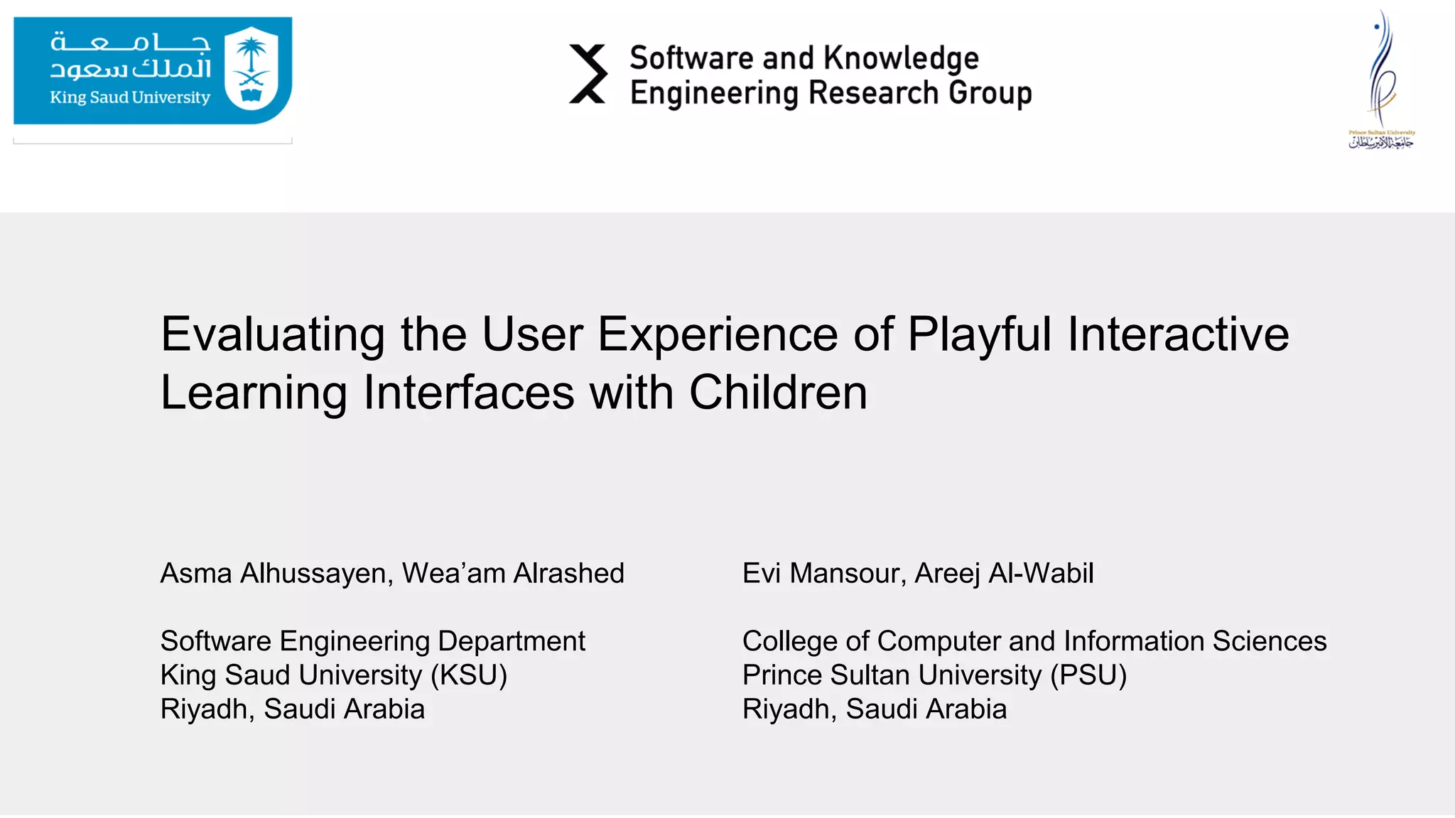 The document discusses an exploratory study evaluating the user experience of playful interactive learning interfaces for children in Saudi Arabian schools, focusing on 64 female students in grades 1-6. Results indicated that while overall enjoyment was high, there were challenges with the website registration process, particularly for younger children. Recommendations for improving user experience include simplifying registration, varying content by age, and providing engaging voice instructions.