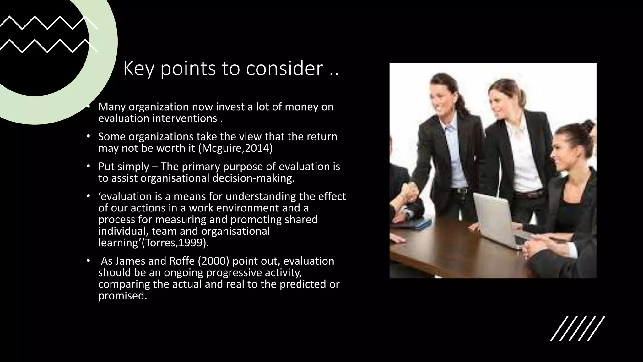 The document discusses the importance of evaluating training outcomes and the involvement of models like Kirkpatrick's four levels taxonomy and the balanced scorecard. Despite significant investments in training evaluations, organizations often hesitate to evaluate due to challenges like the cost-benefit ratio and difficulties in measuring training effectiveness. It advocates for a more nuanced approach to evaluation, emphasizing methods that align with organizational performance and the need for effective learning initiatives.