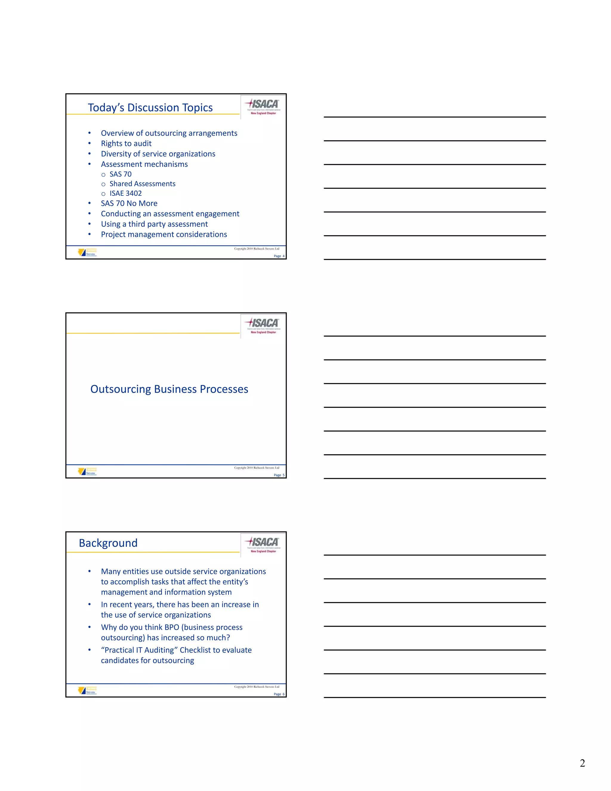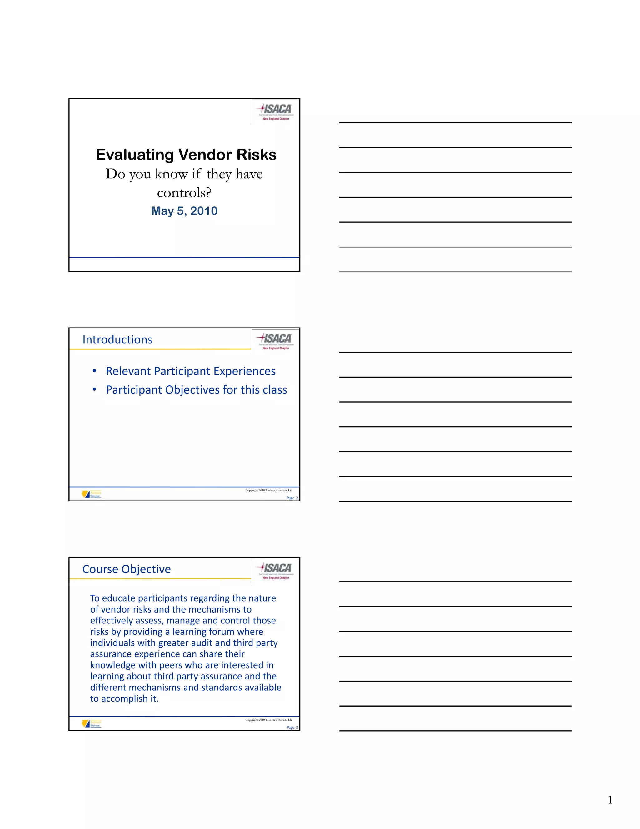 This document provides an overview of evaluating vendor risks at service organizations. It discusses assessing, managing, and controlling risks posed by third party vendors. The document outlines various assessment mechanisms for evaluating internal controls at service organizations, such as SAS 70, Shared Assessments, and ISAE 3402 reports. It also discusses how user organizations can obtain assurance about service organization controls through third party assurance engagements.