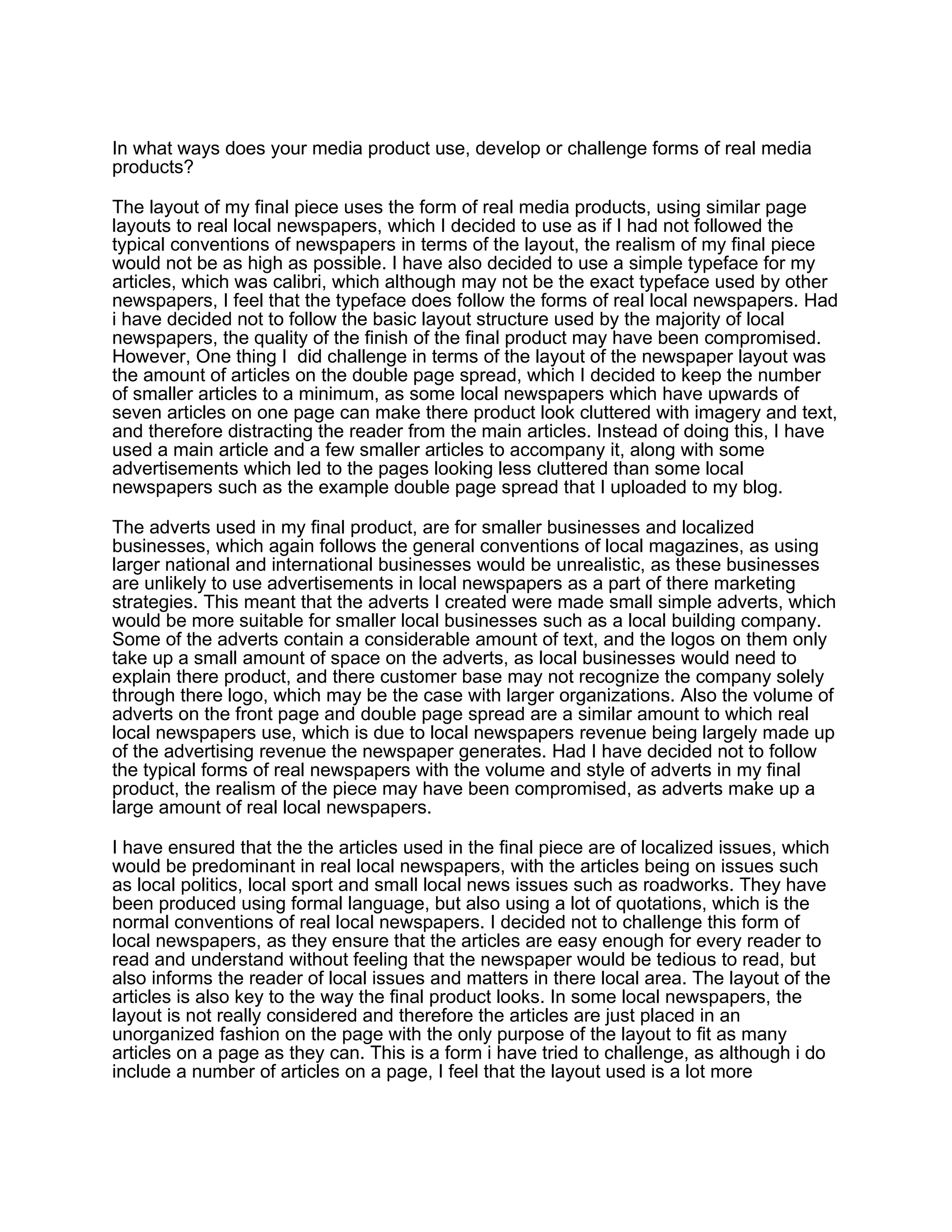 The media product uses the form and layout conventions of real local newspapers to appear realistic. This includes using a similar page layout, simple fonts, and number/style of advertisements similar to real newspapers. However, one way it challenges conventions is using fewer articles per page to avoid clutter. The articles focus on local issues in formal language with quotations, as in real newspapers. Images were taken with a similar camera to those used by local papers and depict article topics to match real newspaper standards. Overall, following conventions helps the realism but some, like cluttered pages, were challenged for usability.