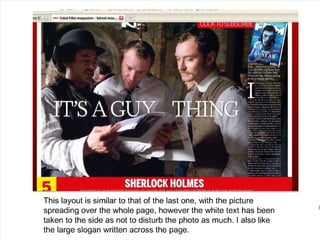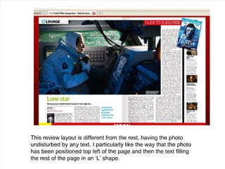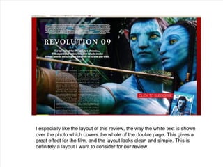 The document discusses the design process for a film poster and magazine review created to promote a student film. Research was conducted on real film marketing materials to identify conventions. The poster features the protagonist in color against a black and white background to convey mood. Continuity was maintained between the poster and review through matching font, color scheme, and feel. Feedback suggests the photos could be of higher quality and the review text could be more advanced.