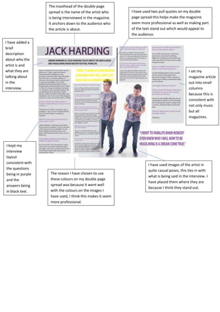 The document describes the layout choices made for a magazine double page spread interviewing an artist. These include using the artist's name in large text at the top, a brief description of the artist and interview below, questions in purple and answers in black, casual images of the artist placed prominently to relate to the interview content, and pull quotes to make the text more appealing and professional.