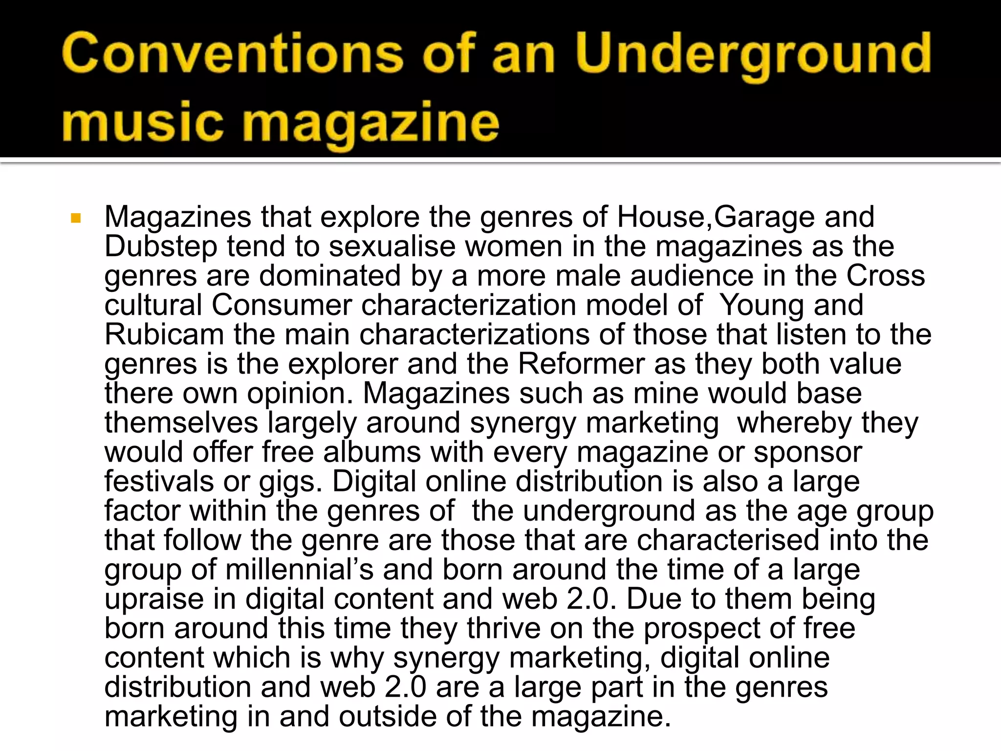 The document discusses the portrayal of women in underground music magazines, highlighting the sexualization often found in genres like house, garage, and dubstep, while emphasizing the author's intention to create a gender-neutral, sophisticated magazine. It outlines key magazine design elements such as cover layout, color coordination, and the significance of accompanying images and text to attract the target audience. The author defines their distinct approach to magazine conventions, particularly in the contents and double-page spread designs, aiming for a more independent style that appeals to a specific income demographic.