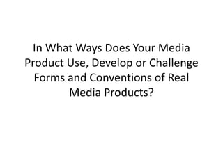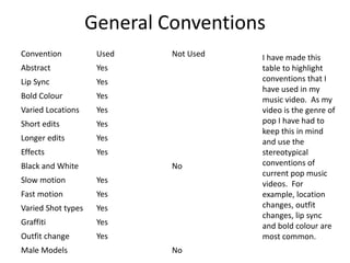 This document discusses conventions used in media products like music videos and their application in the author's own media project. It includes a table outlining conventions that were used (like lip syncing, varied locations, effects) and not used (like black and white, male models). The document also provides examples of conventions used in pop music advertisements, album artwork, and digipaks. It describes design choices like fonts, imagery, colors, and layouts and how they help portray the intended style and message based on genre conventions.
