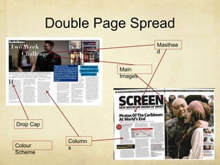 The document summarizes how the media product uses conventions of real media forms. It discusses using a masthead in the top left, a large central image, drop caps for important text, columns to break up text, and a blue/white color scheme for the double page spread. For the radio advert it used short expert interviews, voxpops, a 30 second length to fit slots, and background music. The documentary included presenters for structure, brief voiceover, changing background music, voxpops to engage viewers, experts for facts, and minimal archival footage to pose questions.