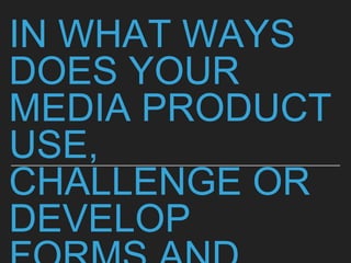 Several shots are described that show characters overcoming obstacles or finding confidence, represented metaphorically through imagery of emerging from darkness into light. Other shots depict characters as powerful or dominant through their positioning, costumes, and surroundings. Common music video techniques are also discussed, such as using certain colors, lighting, costumes or scenarios to convey emotions or move plot lines forward. Intercultural references and transformations of familiar characters are also analyzed for their symbolic meanings.