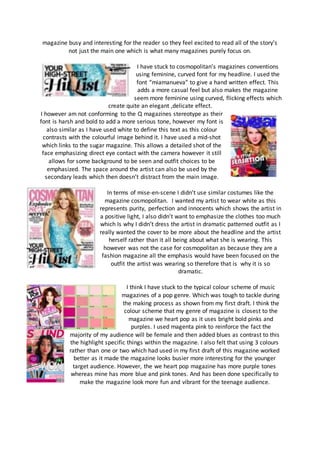 The document summarizes how the author's media product, a music magazine, uses and develops conventions from existing music magazines. The author researched magazines like "We Heart Pop" and "Vibe" to inform design choices for layout, fonts, colors, cover images, and other elements. While conforming to conventions like bold fonts and rule of thirds composition, the author also challenged conventions by including an editor's letter and multiple images on the contents page to provide more context for articles. The goal was to create a magazine that would appeal to 13-21 year olds with its bright, busy design while putting emphasis on the artists and stories featured.