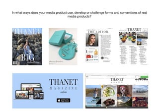 The document discusses the conventions and forms used across various elements of a regional magazine media product, including the front cover, advertisement page, editorial page, contents page, billboard, and website.