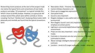 The document analyzes the conventions of comedy films like 22 Jump Street and Hot Fuzz. It finds that comedies typically use naturalistic shots, camera movement following characters, close-ups, fast pacing, diegetic sound, lighting, props, contrasting characters, and locations relevant to the target audience. Comedies can be slapstick, dark humor, or wordplay. The author's film introduction incorporates many conventions like music, shots, and visual effects to set different atmospheres and contrast slapstick and dark humor. However, it challenges comedy conventions by having less exaggerated characters to create a more serious drama atmosphere.