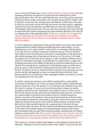 The document discusses how a student media project utilizes, develops, and challenges conventions of the thriller genre. It examines how the project uses conventions like voyeurism and linking shots to create tension. It also challenges some conventions, like including transitions instead of only fast cuts. The characters follow some conventions as the victim is a young woman and attacker is a large man. However, it also updates this by having the attacker deceive the victim through social media. The costumes also emphasize differences between characters to set up the conventional victim-attacker dynamic but convey meaning through semiology. Overall, the project strategically employs, builds on, and modifies established thriller genre conventions.