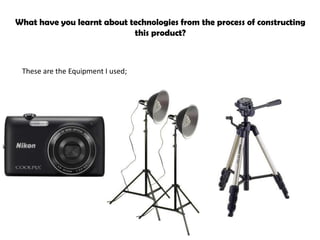 The document discusses the technologies and programs used to create a magazine project. It describes using Adobe Photoshop to edit images, including adjusting brightness, lighting, and cropping. Adobe InDesign was used to layout the magazine pages. Through this process, the author learned new skills with these programs and how to successfully use various tools. They have gained more knowledge and confidence in using technology after overcoming initial uncertainties in bringing their design ideas to life through digital means.