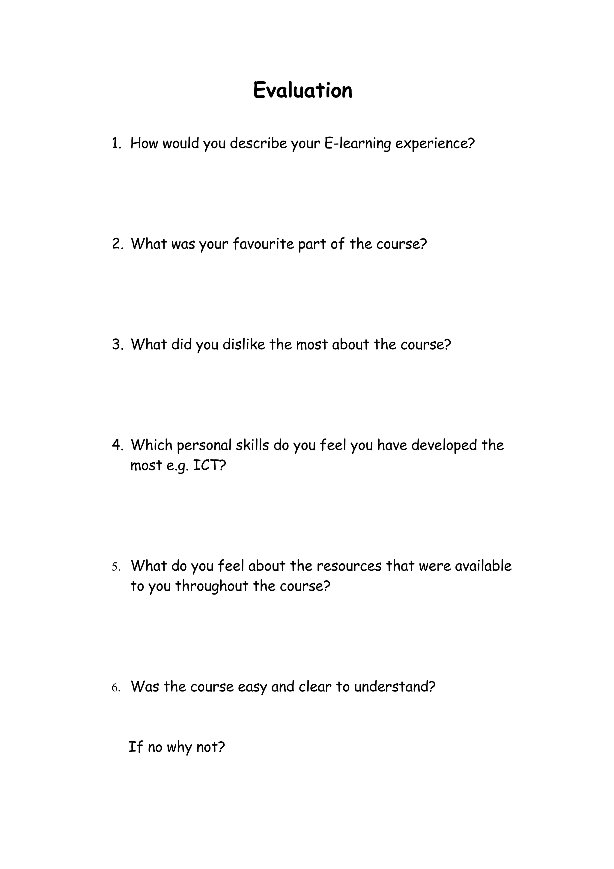 The document contains a 10 question evaluation survey about an e-learning course experience. It asks the participant to describe their experience, identify their favorite and least favorite parts, which skills they developed, their thoughts on available resources, how easy the course was to understand, what they would change, what they learned overall, if they would recommend it to others and take another e-learning course.