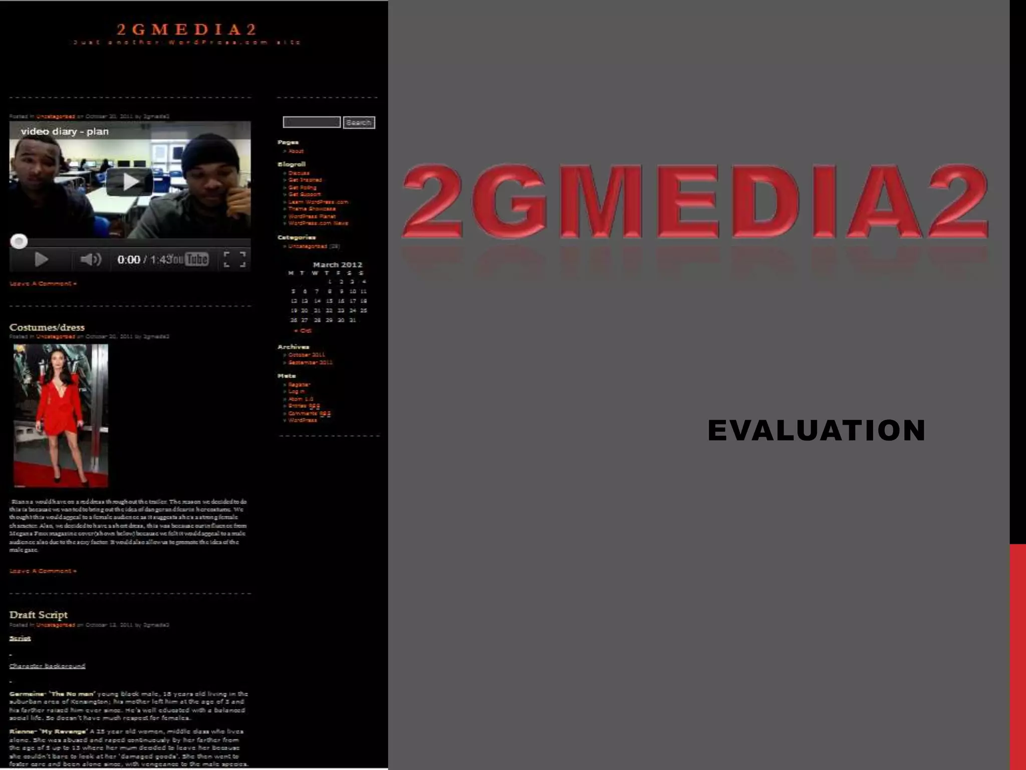 The document discusses the media group 2GMEDIA2's evaluation of their horror trailer and ancillary materials. They used captions in the trailer to convey the storyline without a narrative voice. Dark settings and a range of creepy soundtracks helped set the atmosphere. Feedback from audiences suggested rearranging scenes from day to night for better flow, adding fades between scenes, and fixing shots that were too close or had parts cut out of frame. Ancillary materials like posters and magazines maintained the group's color scheme and featured their supernatural figure to keep their brand consistent.