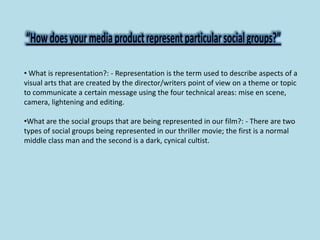 This document summarizes the representation of two social groups in a thriller film. The first group represented is a "normal middle class man" shown through lighting, mise en scene of a typical suburban home, and shots that portray his everyday, conventional life. The second group is a "dark, cynical cultist" represented through changing lighting to seem darker once inside the home, mise en scene of objects showing his cult involvement, and close-ups showing a change in facial expressions and dual personality. Both groups are represented to contrast normality with involvement in a dark cult.