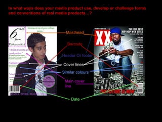 It compares the created cover and contents page to real magazines, noting differences in color choices, positioning of elements, and use of images versus text.
