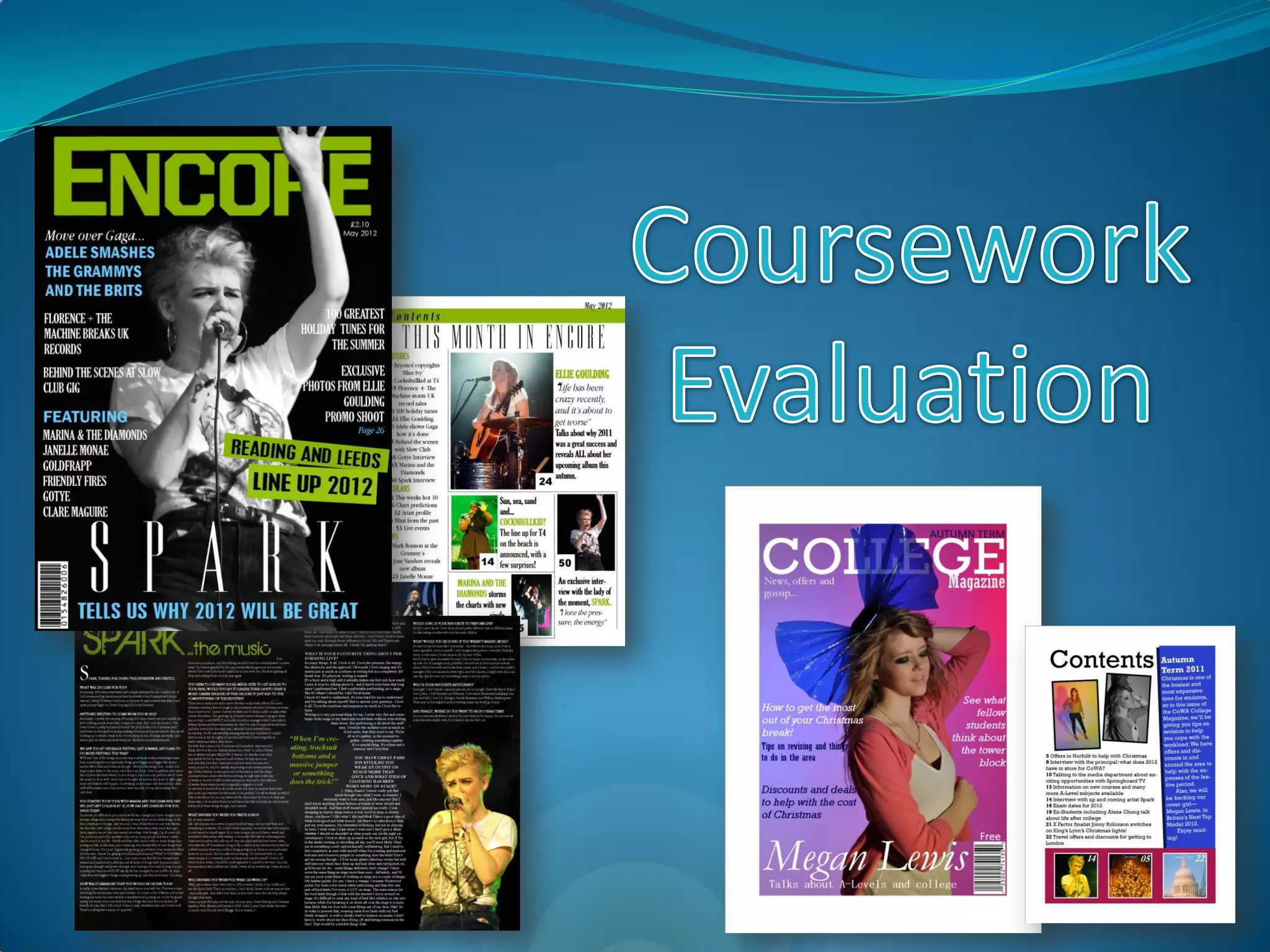 The document discusses the process of designing magazines for a college course. It describes creating a music magazine aimed at teenagers to fill a gap in magazines catering to chart/pop music. It also created a college magazine appealing to prospective college students. The document reflects on lessons learned, such as using bold colors and simple layouts to attract younger audiences, and editing images for professional-looking magazines.