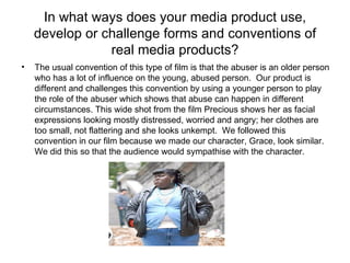 The document provides an evaluation of a media product created by the author. It discusses several ways the product challenged conventions, such as depicting abuse from a younger person rather than an older one. It also summarizes how the product represented particular social groups and addressed its target audience of 16-20 year olds. The author reflects on what they learned about technologies like video editing software and camerawork during the process of constructing the media product.