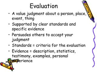This document provides guidance on how to write an evaluation essay. It defines an evaluation as a judgment supported by criteria and evidence that persuades others to accept a viewpoint. It recommends choosing a topic to evaluate, considering the purpose and audience, and generating ideas. Key features of an evaluation include a concise description, clearly defined criteria, a balanced assessment, and well-supported reasons. The document outlines genres like analysis by criteria and comparison/contrast. It provides guidelines for developing an introduction, conclusions, citing sources, and revising.