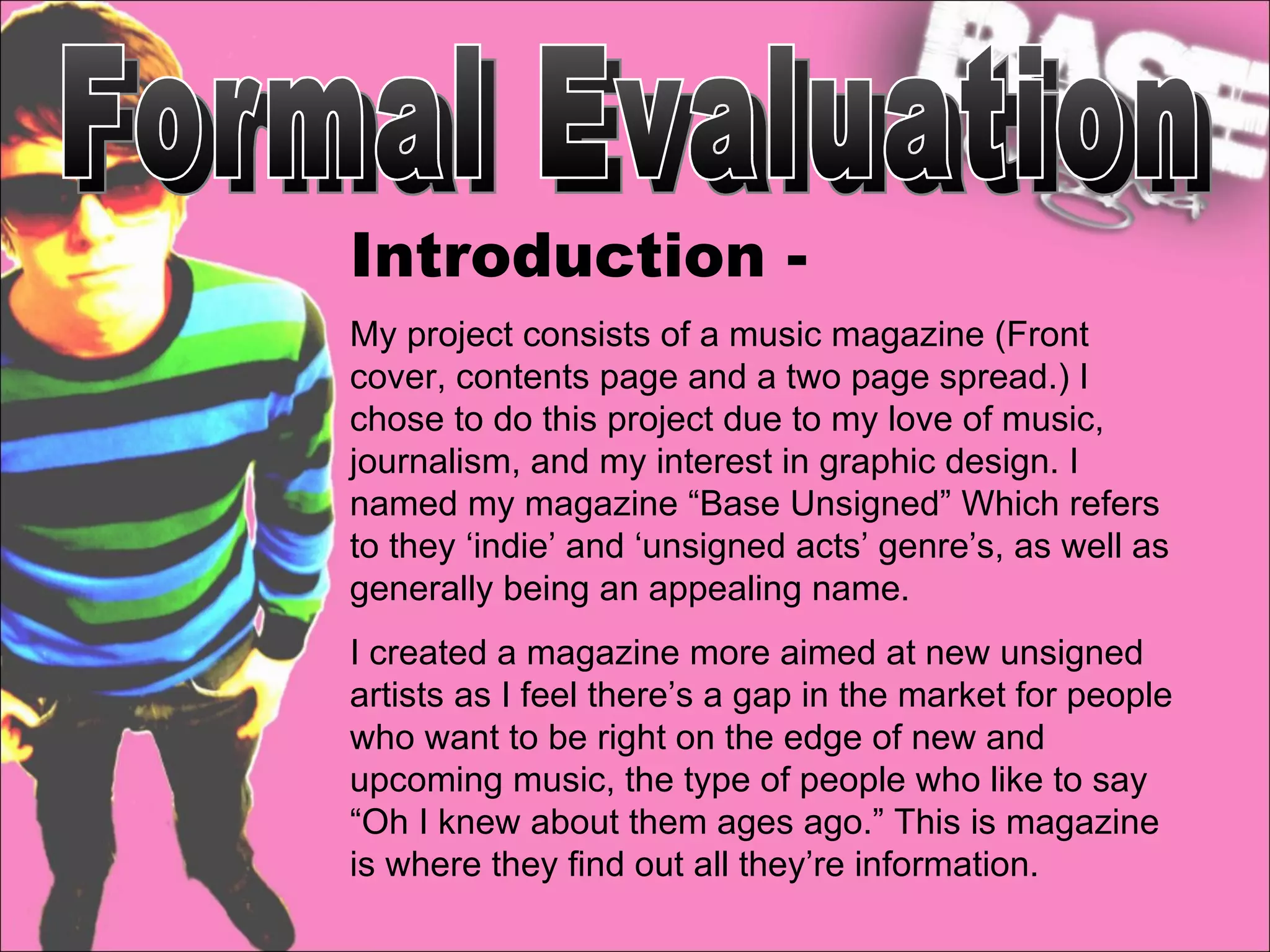 The document describes a music magazine project called "Base Unsigned" created by the author. The magazine aims to promote new unsigned artists, filling a gap in coverage of up-and-coming indie acts. Key aspects included a colorful front cover promoting the magazine's focus on unsigned artists, a busy contents page highlighting new music and tours, and a two-page article following conventions like quotes but challenging stereotypes with its design. Feedback praised the professional layout and use of engaging fonts and images.