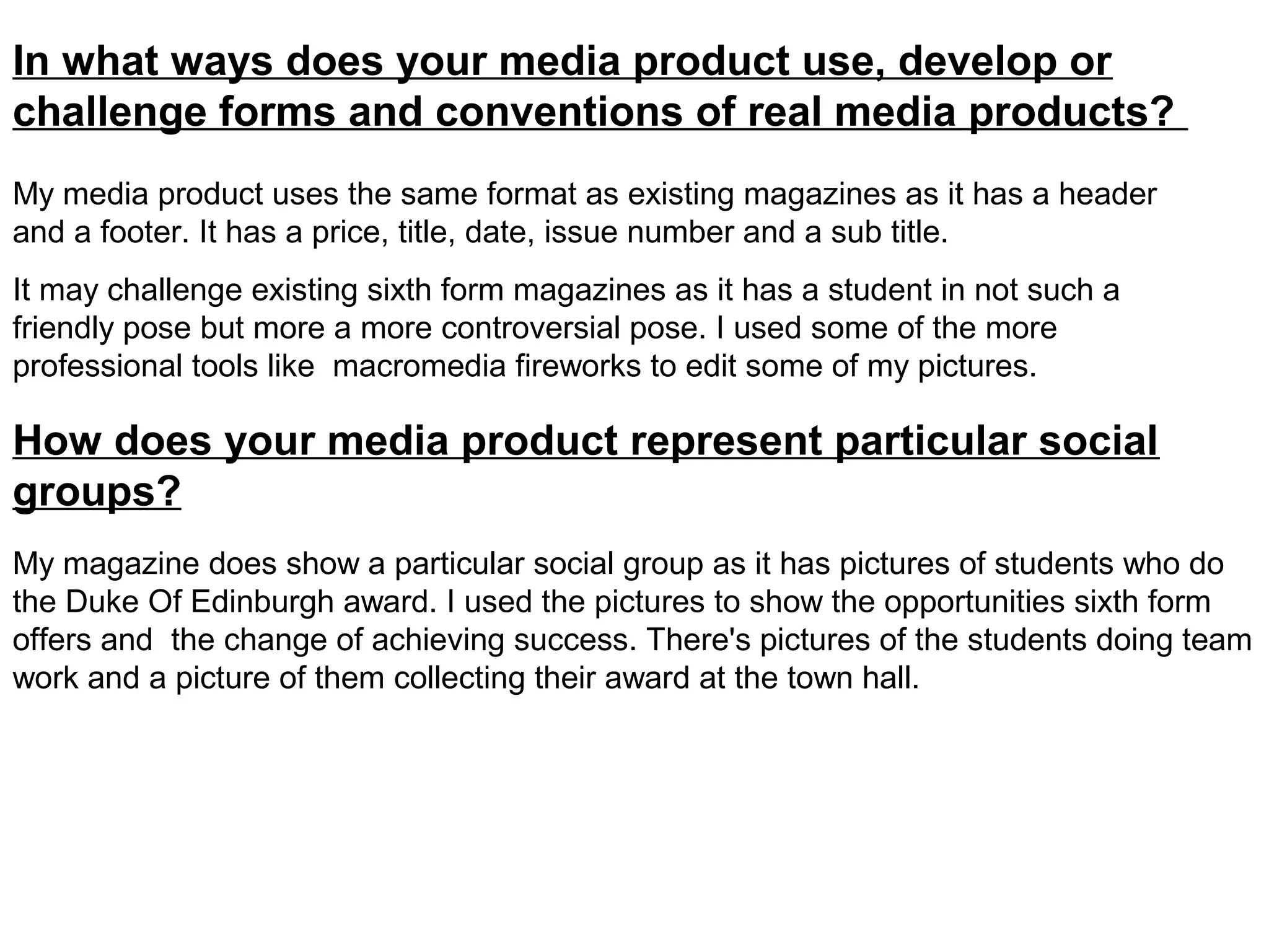 The document summarizes the student's media product, which is a magazine for their sixth form school. It uses a similar format to existing magazines with a header, footer, price, title, date, and issue number. It may challenge conventions by using a more controversial photo of a student. The magazine represents sixth form students doing activities like the Duke of Edinburgh award. The target audience is sixth form students at the school, and the language and content are designed to attract this demographic.