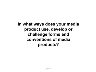 Kay Green created a magazine cover and contents page to evaluate their preliminary media task. They learned to use Adobe Photoshop and InDesign software to edit photos, design pages, and lay out text and images. Specifically, Kay used tools in Photoshop like heal, auto tone, and patterns to edit images for the cover. In InDesign, Kay set up a two-page spread and learned to import images, size frames, and position text boxes to layout the contents page. Overall, the process taught Kay skills using digital technologies like cameras, photo editing, and page design software.