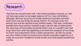 The document summarizes the student's process for creating a children's storybook as part of a class project. They did secondary research as primary research with children was not possible. Existing children's books influenced the simple design. Planning allowed experimenting with color schemes before choosing one to tie the pages together. Production challenges included issues with photo editing software but the student worked around problems. Feedback from parents was positive about interactive elements that challenged children.