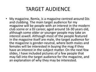 The document discusses the target audience for a magazine called Remix about DJs and club culture. The target audience is people aged 16-30 with an interest in clubbing or pursuing a DJ career. Both males and females are included. Several photos are presented of people who fit the target demographic, such as clubgoers and DJs, to illustrate the type of readers the magazine aims to attract.