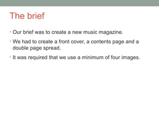 The document summarizes Sophie Panton's evaluation of her media product, a new music magazine. It discusses how her front cover, contents page, and double page spread utilized and challenged conventions of real media products. It also covers how her magazine represented social groups, potential media institutions for distribution, how she addressed her target audience, and what she learned about technologies from constructing the magazine.