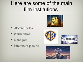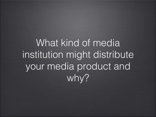 The document discusses potential media institutions for distributing a science fiction film, outlining specific films by 20th Century Fox, Warner Bros, Lions Gate, and Paramount Pictures. It suggests that 20th Century Fox would be a suitable distributor due to its historical engagement with similar films, but also considers Fox Searchlight as an alternative for its focus on independent films. The target audience is identified as individuals aged 15 to late 30s, and strategies to attract a broad audience are described, including diverse character representation.