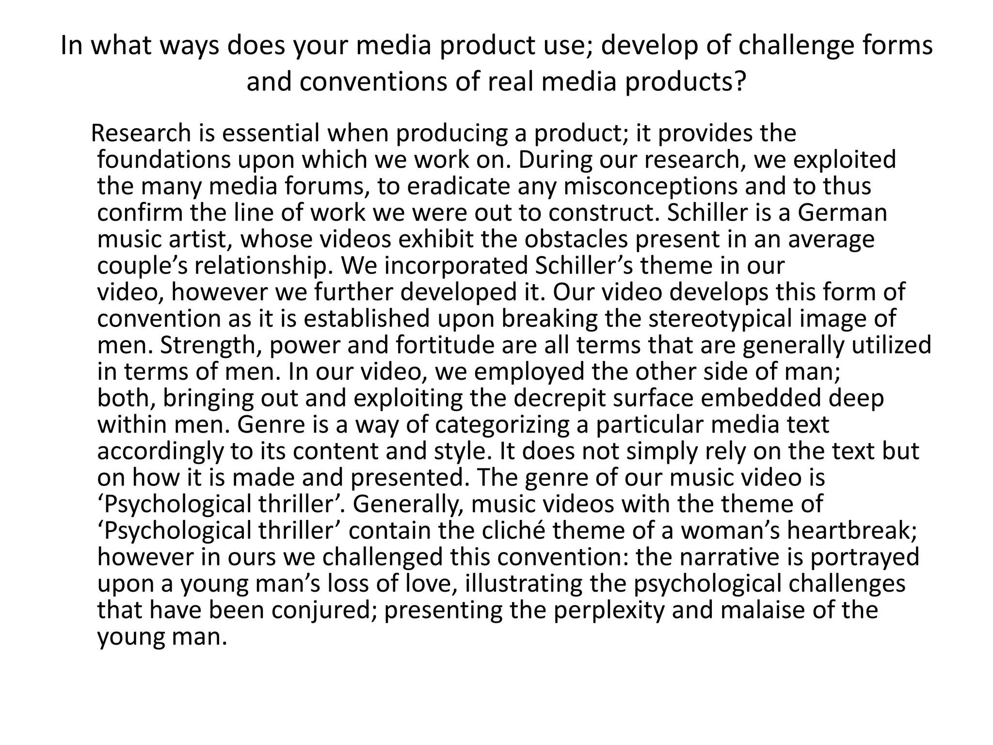 The document discusses the production of a music video for a German artist named Schiller. It explores how the video challenges conventions of the psychological thriller genre by focusing on a young man's loss of love rather than a woman's heartbreak. Audience feedback was gathered through focus groups and questionnaires to understand how the video would be received and make any necessary changes. A variety of media technologies were used in planning, construction, and evaluation, including YouTube, Google, DSLR cameras, tripods, lights, and editing software.