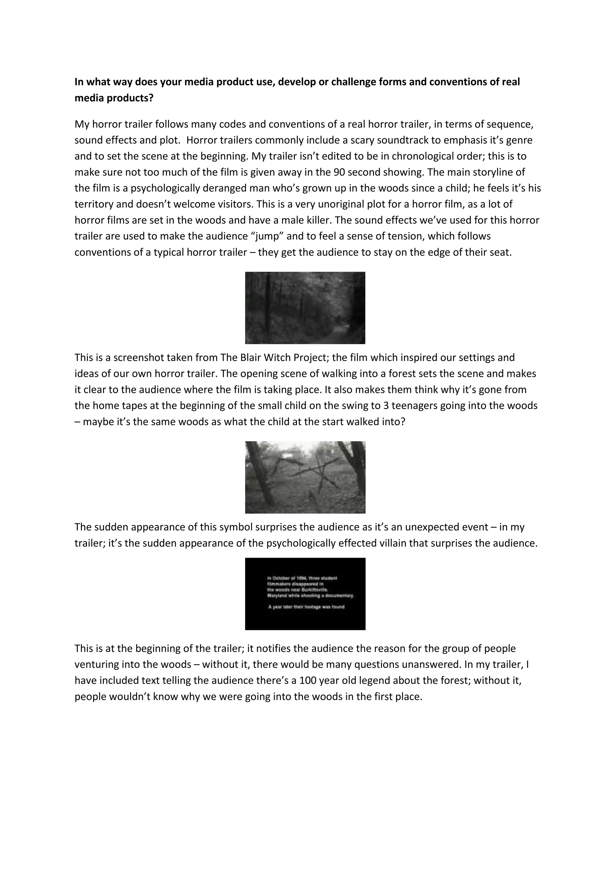 This document discusses the media product created by the student, which is a horror film trailer. It summarizes that the trailer follows conventions of real horror trailers in its sequencing, sounds, and plot. Though the plot is unoriginal, it uses sounds to create tension and jump scares as typical horror trailers do. The trailer is also not in chronological order to avoid revealing too much. It then discusses how the student's magazine and poster promoting the trailer use similar conventions like dark edges and featuring the main character. Various media technologies like YouTube, Adobe Premiere Pro, and SoundDog were used in planning, research, and evaluation stages.