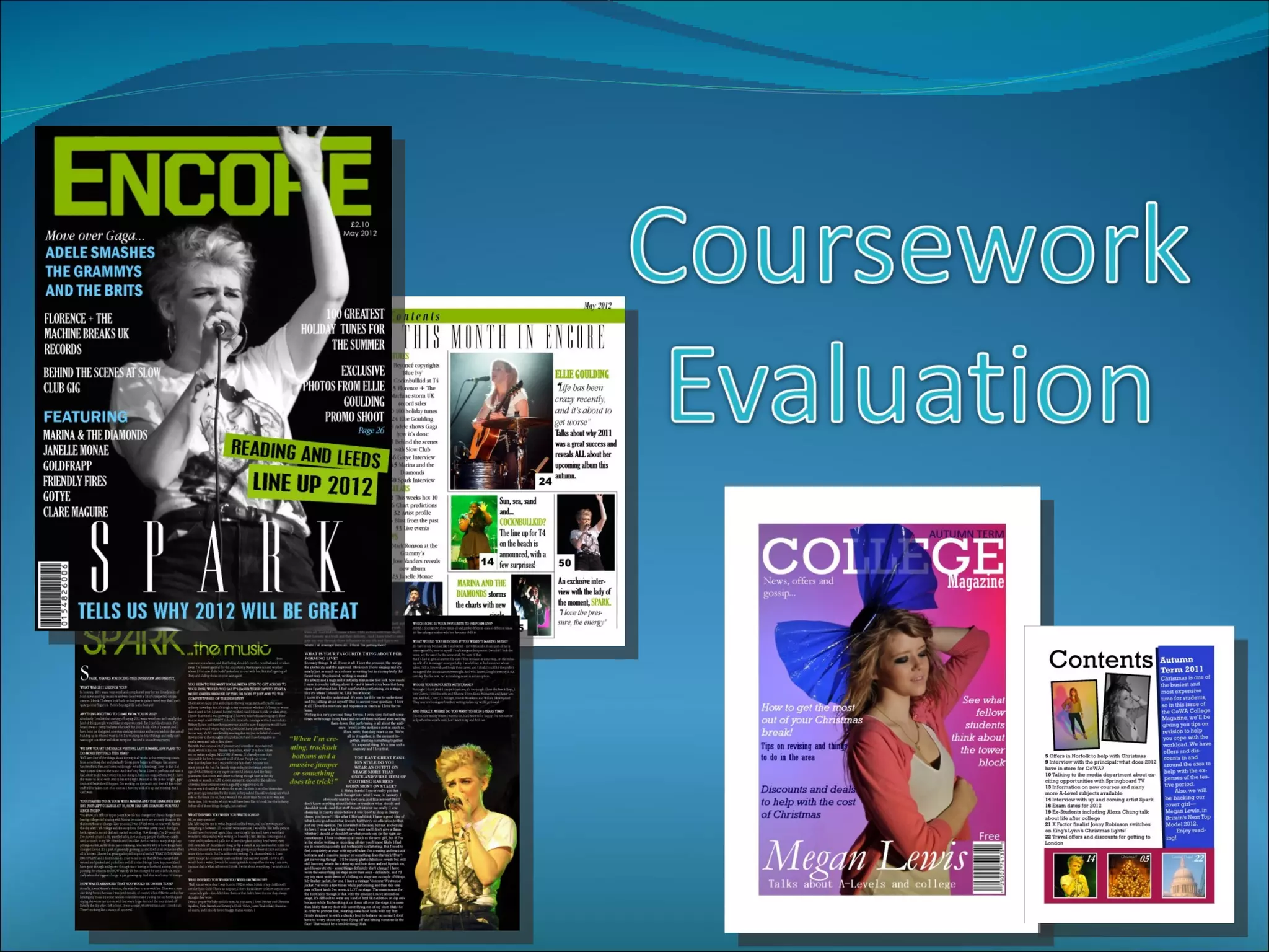 The document discusses the process of designing magazines for a college course. It describes creating a music magazine aimed at teenagers to fill a gap in magazines catering to chart/pop music. It also created a college magazine appealing to prospective college students. Key learnings included using simple backgrounds and colors that complemented images to direct attention. Formats from other magazines like NME and New were inspirations. The final magazines featured informal language and bold colors to attract teenage audiences.