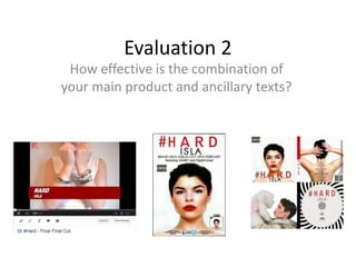 The document discusses the connection between a main video product and two ancillary texts, a digipack and poster. It summarizes that the front cover image of the ancillary texts clearly connects to a scene in the video by showing three girls with identical looks. Throughout both the video and ancillary texts, the main model maintains a consistent rebellious style with provocative clothing and nudity. Red lipstick is used on all models in both pieces to unite them. The same font is used for all text to ensure consistency. The same striking front cover image is used on both the digipack and poster to make the product more memorable. Scenes from the video are featured inside the digipack to show a strong connection