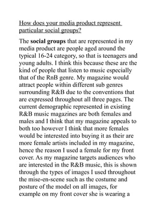 The media product represents people aged 16-24, specifically teenagers and young adults who listen to R&B music. Both females and males are represented in existing R&B music magazines, but the magazine appeals more to females since it features more female artists. Images used throughout the magazine, such as the model on the cover wearing a hat and pouting, appeal to the target R&B audience.