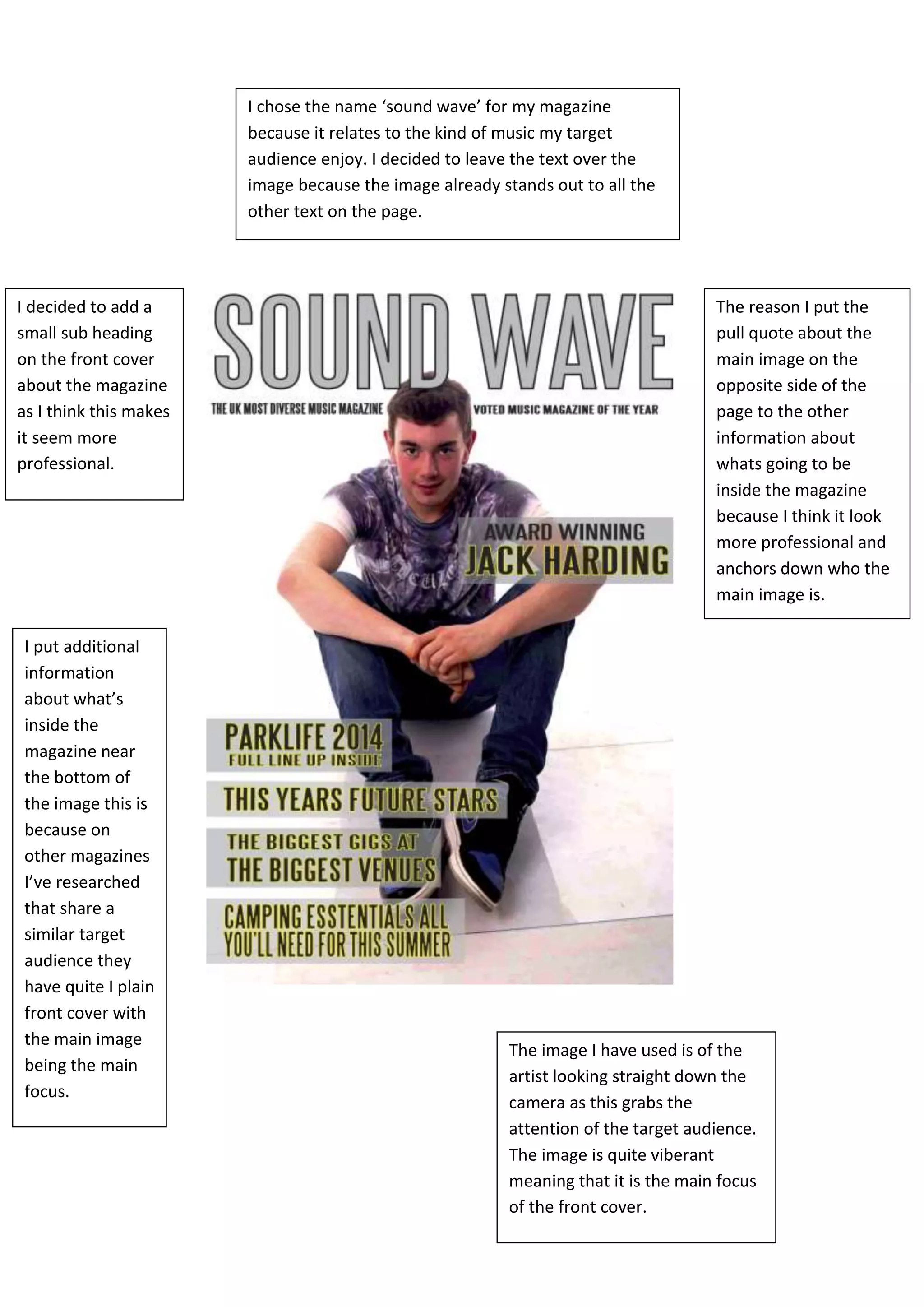 The document discusses design choices made for the front cover of a music magazine. The name "sound wave" was chosen to relate to the target audience's music interests. Text was left over an image to make it stand out, and a subheading was added to seem more professional. Additional interior details were placed near the bottom so the main image remains the focus, as done successfully on other similar magazines. The front image is of an artist looking at the camera to grab attention. A pull quote about the image was placed opposite other interior information to appear more professional and identify the main image.