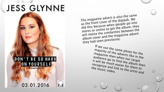 The document discusses comparisons between shots in a music video and images used in promotional materials like a digipak cover and billboard advertisement. Several key similarities are highlighted: