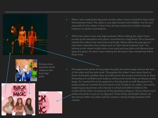 1) Bright, funky colors and high saturation are used consistently across all materials to match the lighthearted, pop genre of the video.