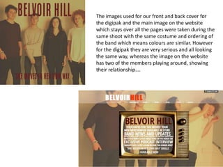 The document discusses how different marketing materials for a band's products are connected to promote synergy. The cover art for the band's digipak and website use matching costumes, colors, and band positioning from the same photo shoot. Additionally, the video aims to show the friendship between band members. Both the digipak and website use the same font color and typeface to further link the materials. Photos on the website also come from the same concert as footage in the music video to give audiences a sense of what attending a live show would be like and encourage ticket purchases.