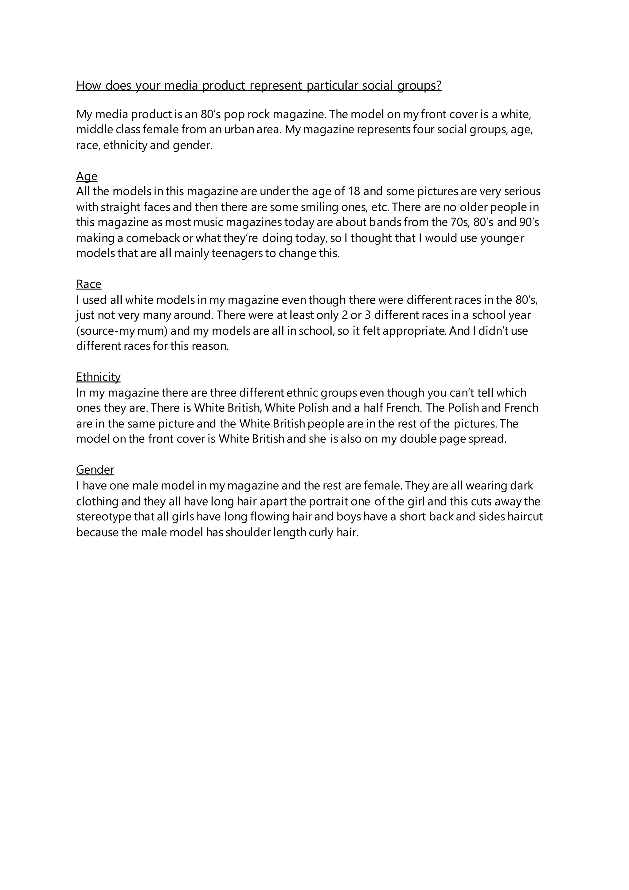 The magazine represents four social groups - age, race, ethnicity, and gender. All the models are under 18 to focus on music from the 70s-90s. The models are all white, as the creator's mother confirmed schools in the 80s had only 2-3 races represented. There are three ethnic groups represented though they cannot be identified. The front cover model and double page spread model are both white British. There is one male model among predominantly female models, challenging stereotypes by showing the male with long hair.