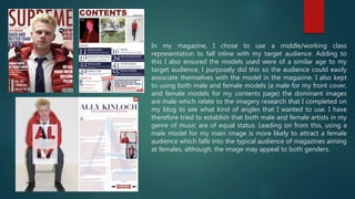 The document discusses representation of social groups in a music magazine. It summarizes that the magazine uses middle/working class models around the same age as the target audience to allow easy association. Both male and female models are used, with a male on the front cover and females inside. The magazine aims to portray male and female artists as equal. Using a male model on the cover is intended to attract a female audience, as females typically buy more music magazines. Shot types like eye-level shots create a relationship with the audience, while mid-long shots on a double page spread allow effects. The contents page uses many pictures rather than text to avoid overwhelming readers.