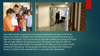 The document discusses how a horror media product represents teenagers aged 16-18. It portrays them as weak, fragile, and unable to stand up for themselves based on a scene where a group of friends are killed without fighting back. Another scene shows a teenager alone in an alley having his neck twisted without time to react, further portraying teenagers as non-threatening and weak. The media product aims to make the killer seem more mysterious and dominant over the vulnerable teenagers.