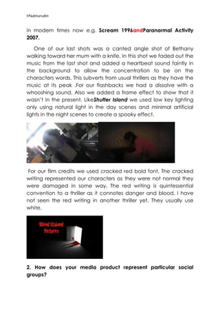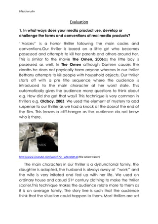 The document provides an evaluation of a student media project titled "Voices" that is a horror/thriller film. It discusses how the film uses conventions of real thriller films through its story of a possessed girl attempting to kill her family. It also addresses how the film represents social groups as a working class family and targets audiences of teenagers through its storyline and cliffhanger ending. The student reflects on what they learned about technologies like cameras, internet research, and blogging from creating the project.