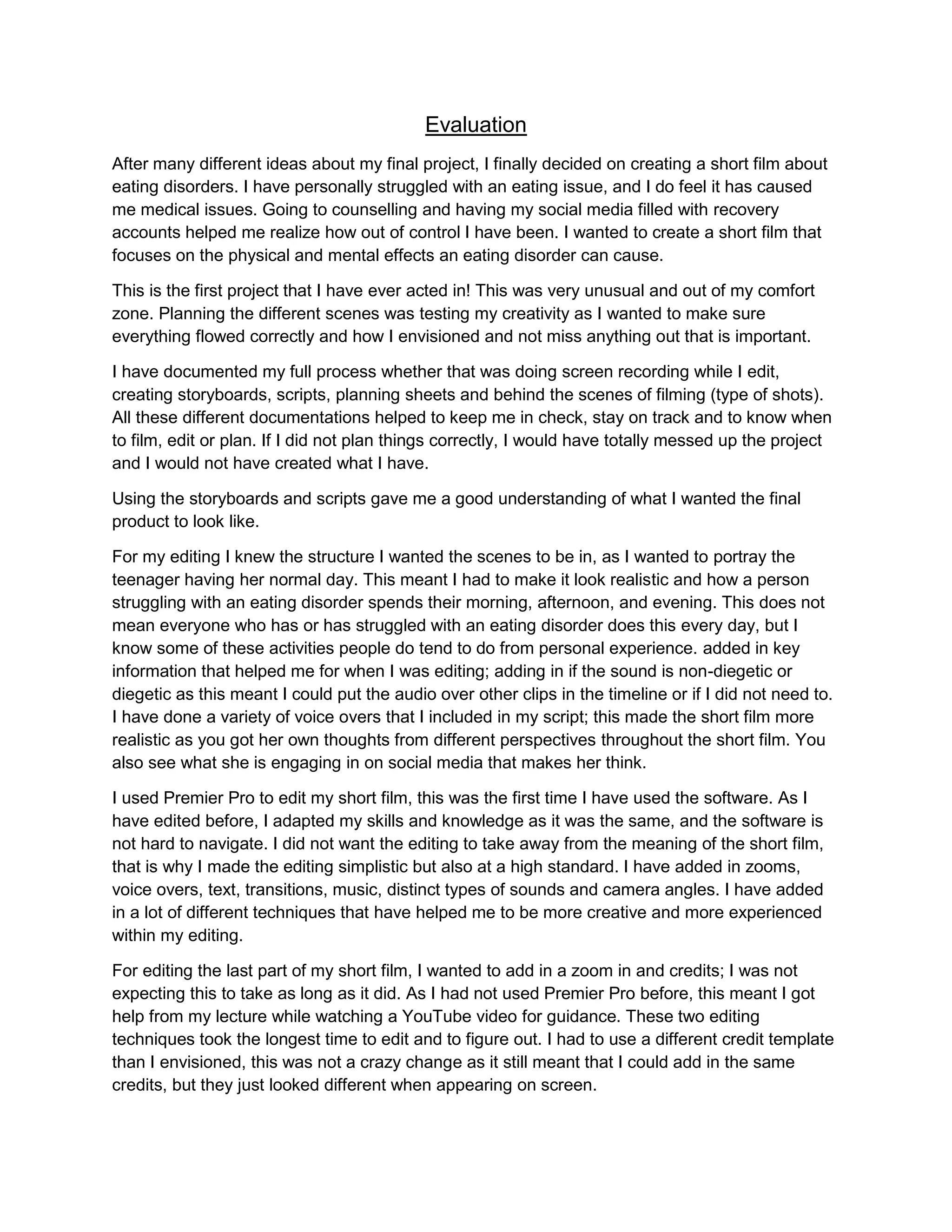 The document details the author's journey in creating a short film about eating disorders, influenced by personal experiences and the desire to raise awareness on the topic. It describes the planning, storyboarding, and editing processes, highlighting challenges encountered, including time management and technical difficulties with editing software. Ultimately, the author expresses satisfaction with the final product while acknowledging potential areas for improvement, particularly regarding the film's ending.