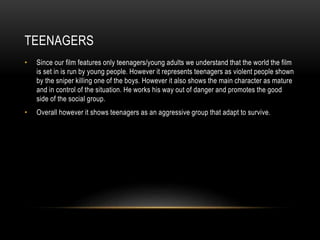 The document discusses how different social groups are represented in a film. It summarizes that teenagers are portrayed as both violent and mature, showing the negative and positive aspects. Males are depicted in a less macho way than typical action films through the use of sounds that emphasize fear. However, the main male character drives an aggressive muscle car that evokes stereotypes. The female character is atypical as a sniper rather than a love interest, which breaks gender norms but could also be seen as portraying females as violent.